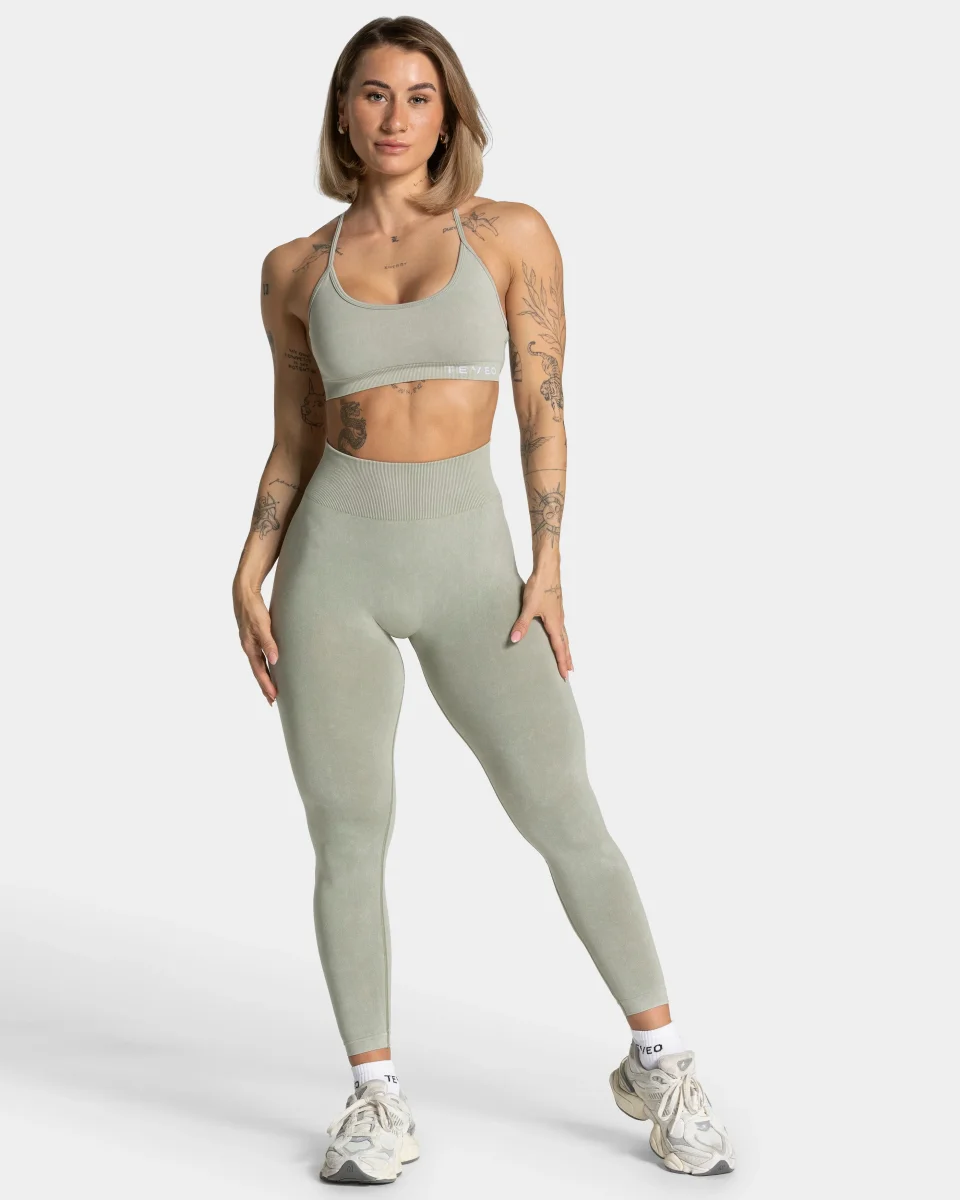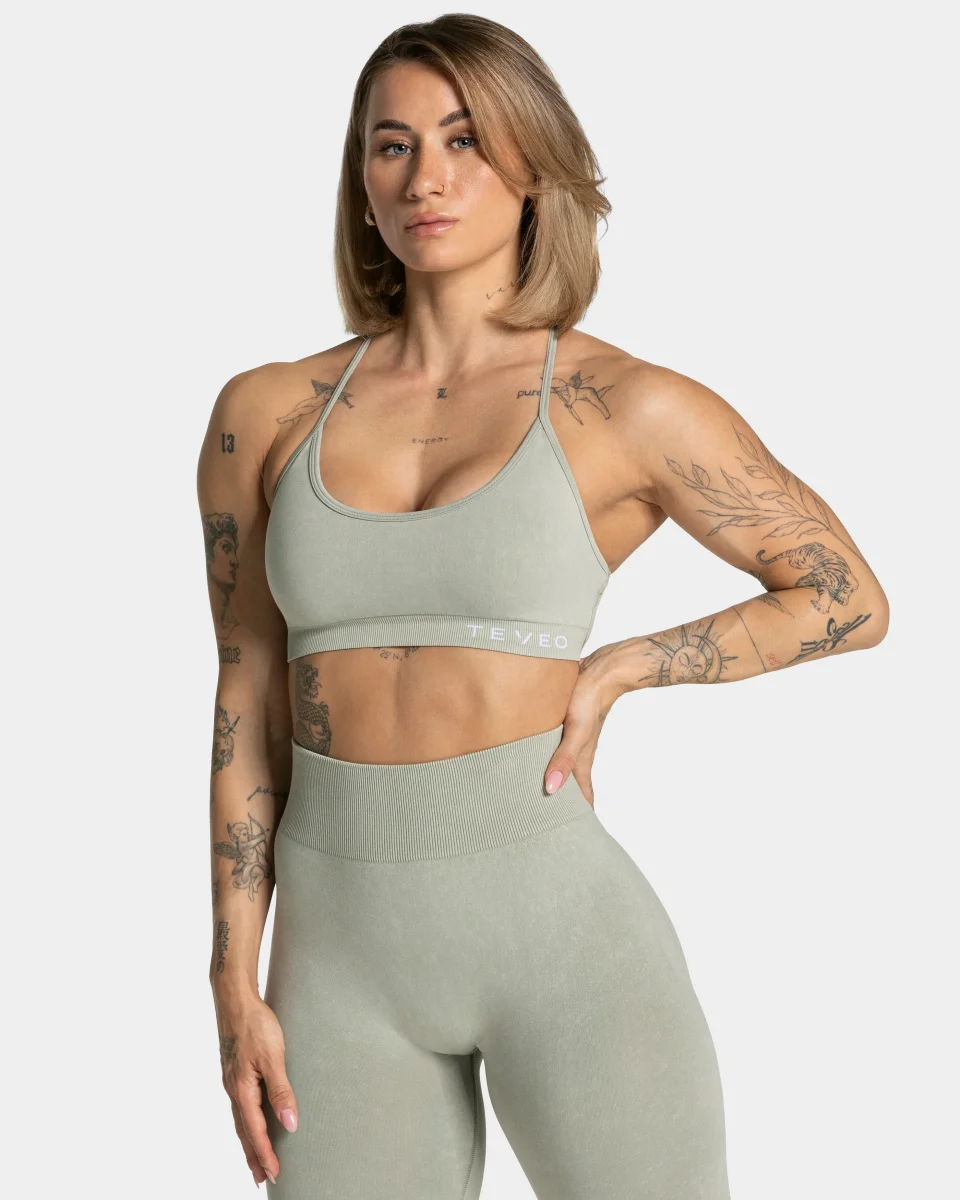 Der Acid BH in Salbei ist kurz geschnitten und bietet dennoch einen guten Halt beim Training. Während er von vorne durch sein klassisches Design mit dem gestickten TEVEO Logo überzeugt, fällt von hinten die detaillierte Schnürung auf. So zaubert er dir einen wunderschönen Rücken.