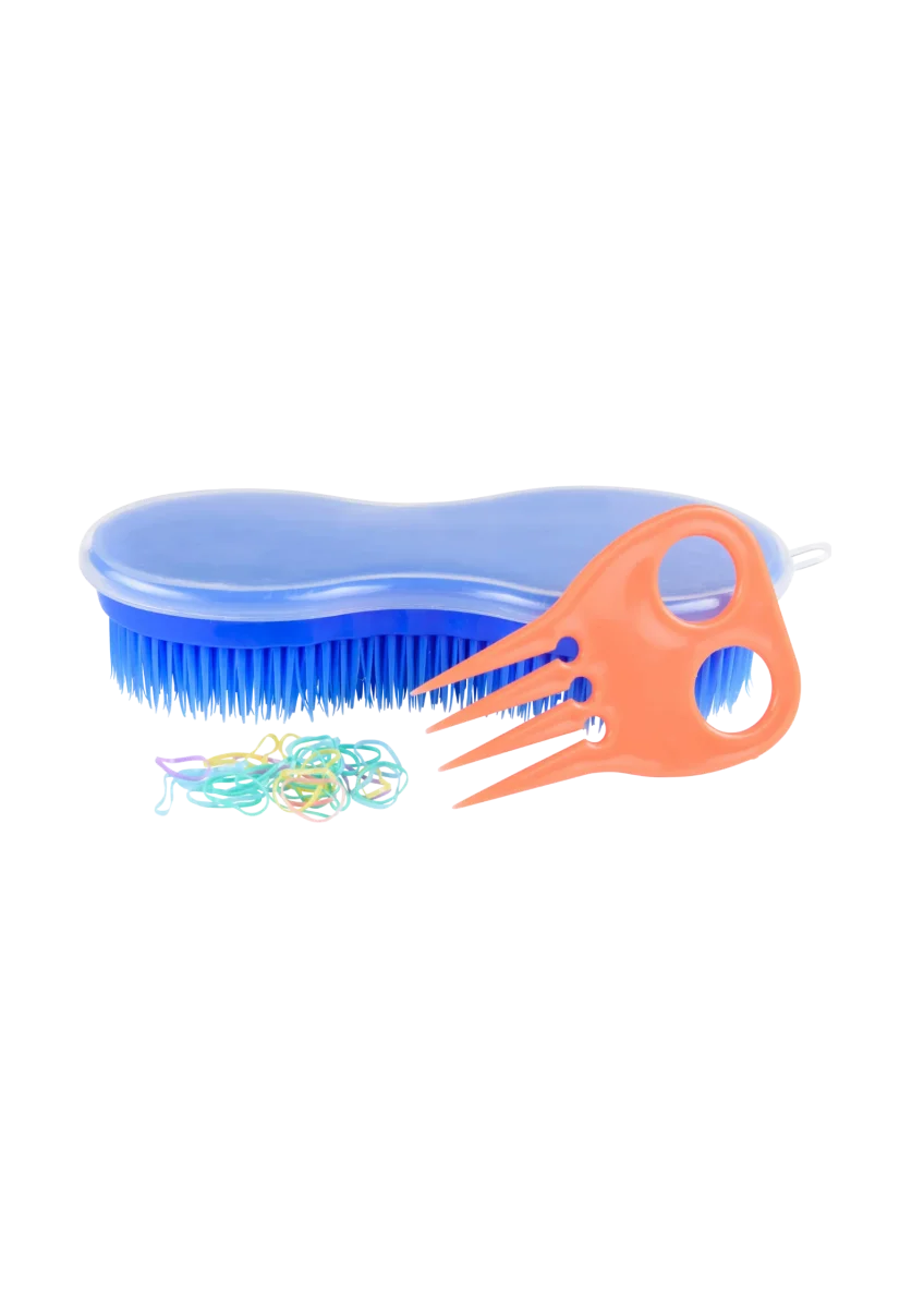 Descriptif Parfaite pour dépoussierer votre cheval. Des élastiques et un peigne sont inclus. Set de 3 brosses.
