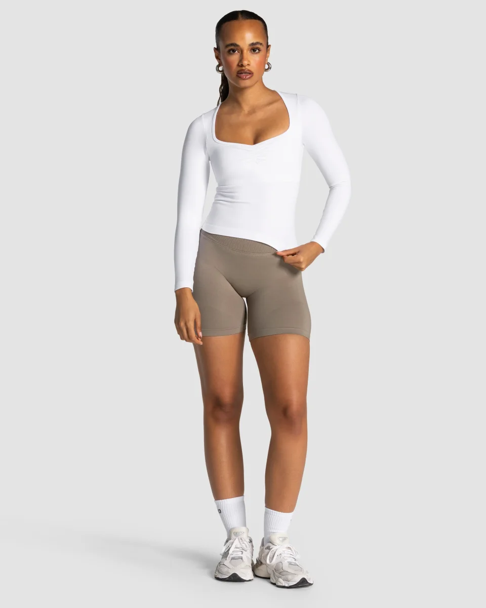 Das Charming Pro Longsleeve in Weiß überzeugt durch sein offenes Dekolleté mit gerafftem Design im Brustbereich. Der integrierte BH mit herausnehmbaren Pads und innenliegendem gerippten Bund bietet zuverlässigen Halt. Mit dem Charming Pro BH erhältst du 2 wechselbare Pads für weitere Anpassungen, während das Kontrast Logo auf der Rückseite einen dezenten Akzent setzt.
