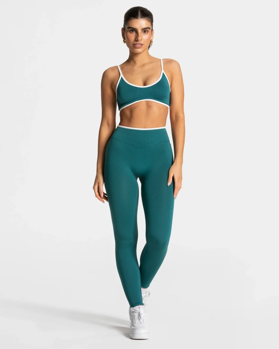 Der Contrastline BH ist in mehreren Farben erhältlich und lässt sich optimal mit der Contrastline Sculpt Scrunch Short oder Leggings sowie dem Contrastline Jogger kombinieren. Hier findest du noch einmal alle Vorteile des Contrastline BHs in Petrol: