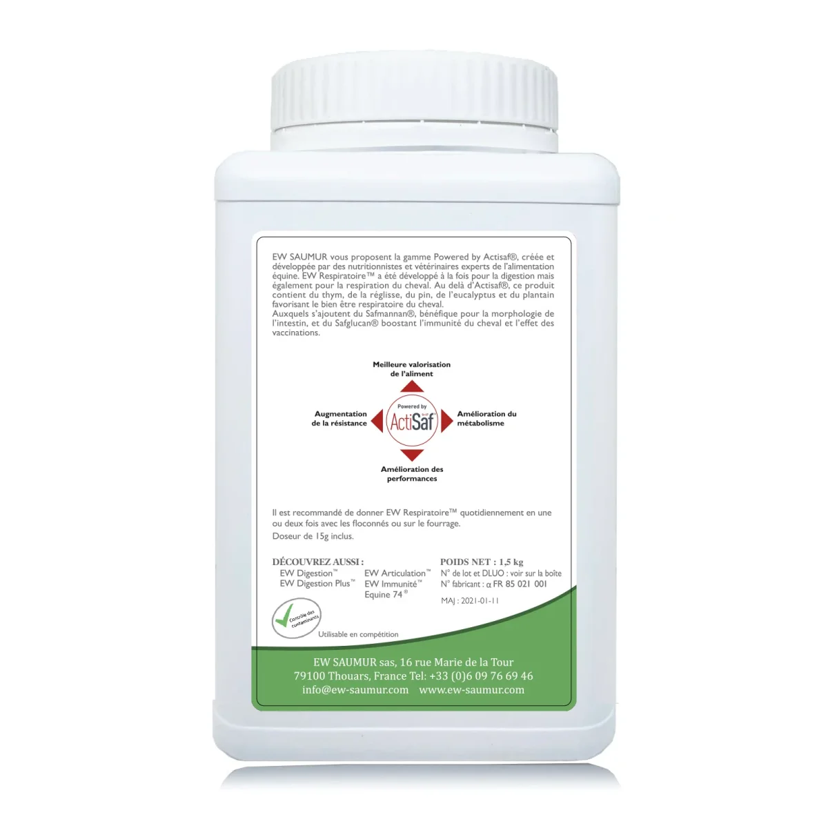 EW Respiratoire™ a été développé à la fois pour la digestion mais également pour la respiration du cheval. Au-delà d’Actisaf®, ce produit contient du thym, de la réglisse, du pin, de l’eucalyptus et du plantain favorisant le bien-être respiratoire du cheval. Auxquels s’ajoutent du Safmannan®, bénéfique pour la morphologie de l’intestin, et du Safglucan® boostant l’immunité du cheval.
