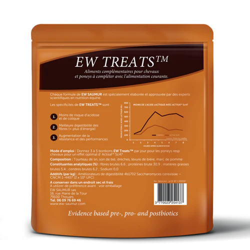 Riche en Actisaf® pour réguler le microbiote intestinal de votre cheval ou poney, très appétisant mais sans sucres ajoutés, les EW Treats™ sont la récompense santé idéale pour votre ami équin. Donnez 3 à 5 bonbons par jour pour un effet optimal d’Actisaf®.