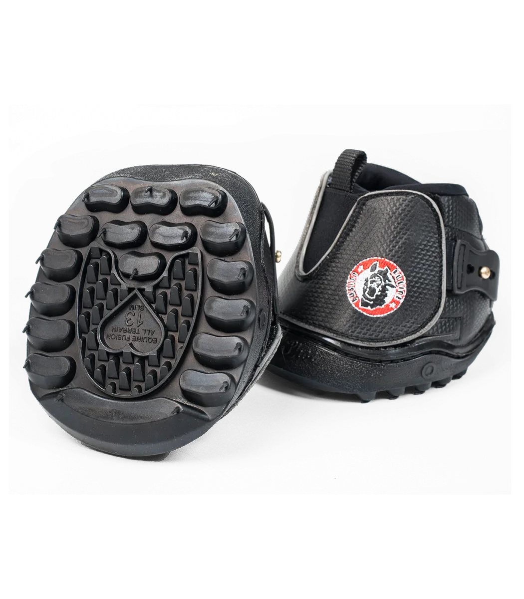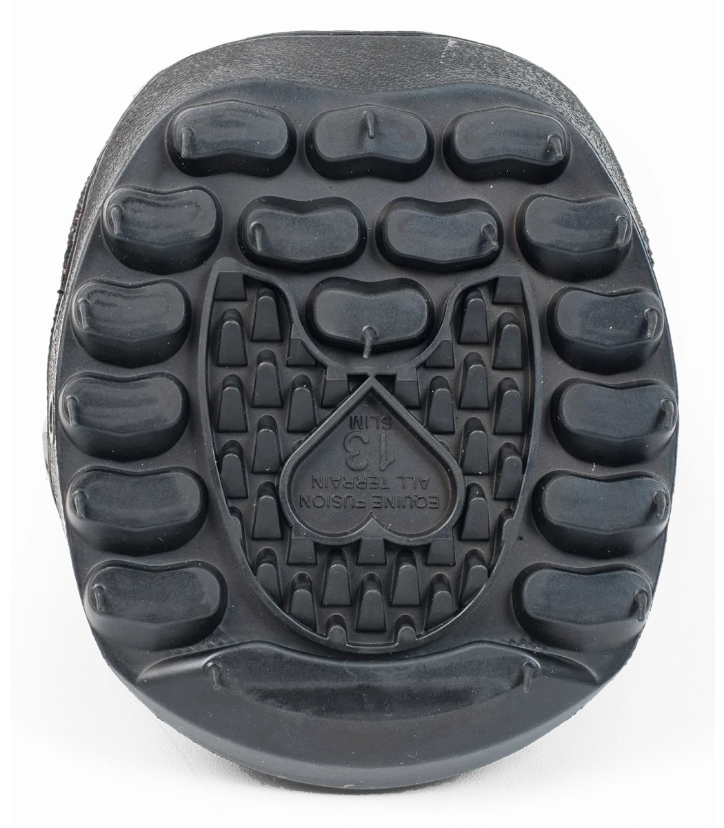 La semelle « All Terrain » au design unique offre une excellente adhérence, un grand amortissement et une grande stabilité. Cela réduit considérablement la charge d’impact sur le cheval. Pour un amortissement encore plus important.