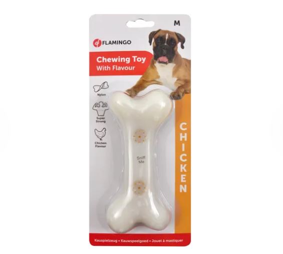 Jouet à mastiquer pour chien sous forme d’os en nylon saveur poulet. L’os de 15 cm convient aux chiens de toutes races et tout âge. Il peut s’utiliser tout au long de l’année en intérieur comme en extérieur.