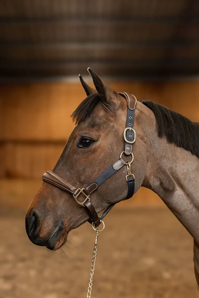 Descriptif – Têtière anatomique à double réglage, rembourrée et doublée de cuir souple – Muserolle rembourrée et doublée de cuir souple – Fixation du sous-gorge par mousqueton – Surpiqûres crème Coloris: Marron avec boucles laiton – Noir avec boucles en laiton chromé