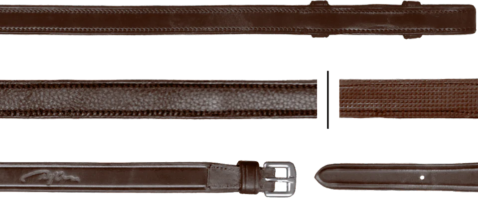 Descriptif Rênes Hunter Grip 5/8 compatibles avec tous les bridons et brides de la New English Collection et de la Dressage Collection cuir plat.