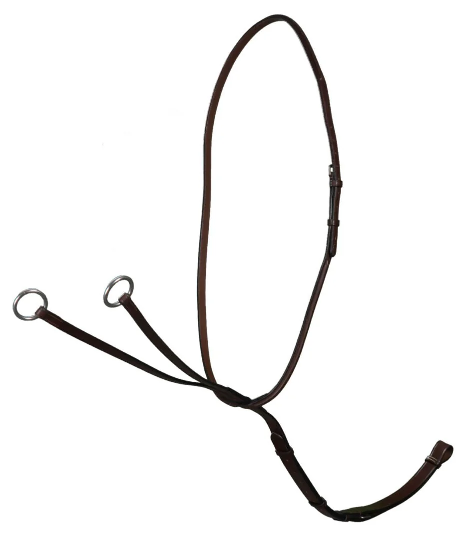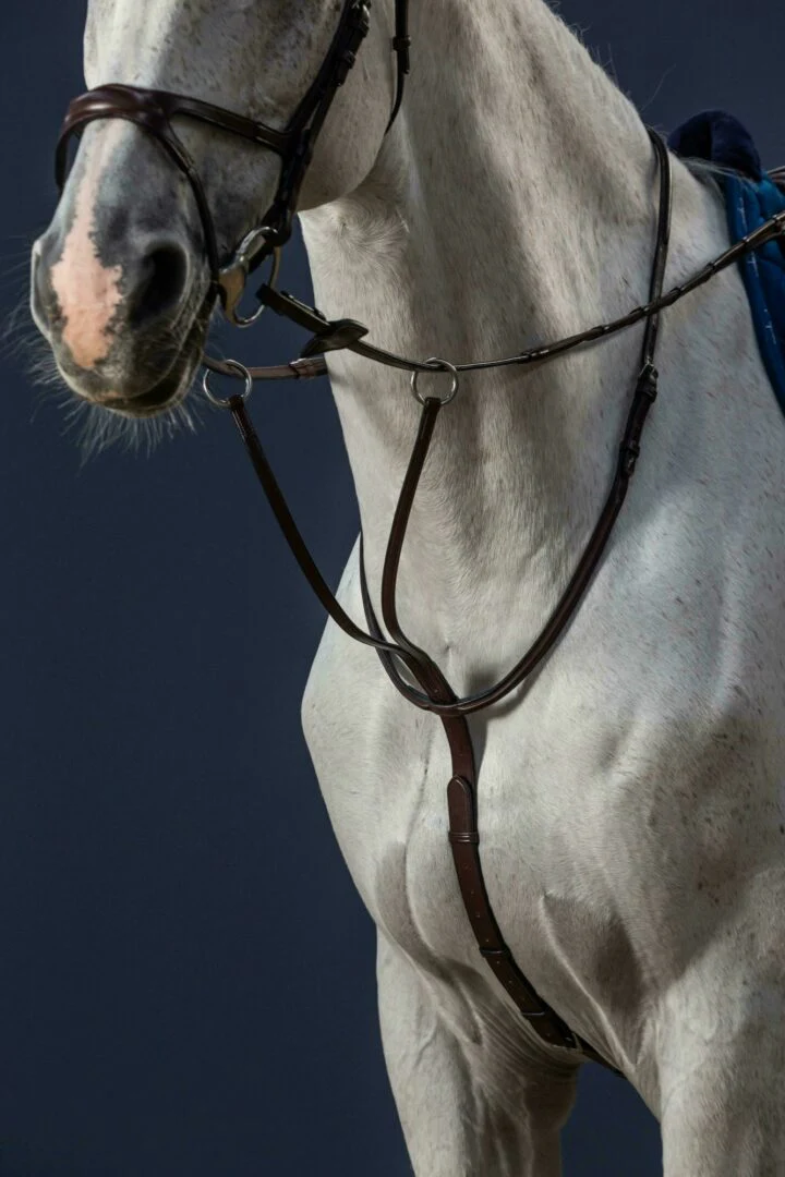 Descriptif Martingale à anneaux en cuir bombé carré avec surpiqure décorative. Ajustement simplifié du côté de la sangle.