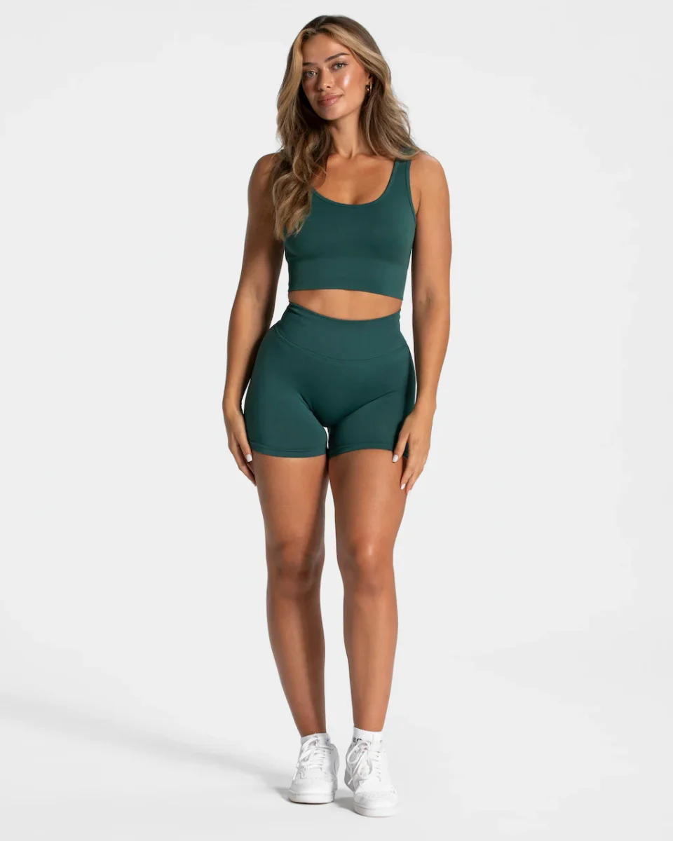 Unsere Sensation Kollektion ist das perfekte Gym Outfit. Sie beinhaltet eine Leggings, Shorts sowie Bh und Crop Top. Die Sensation Short in Dunkelgrün ist unsere kürzeste Short und eignet sich daher besonders für heiße Tage. Sie begeistert ebenso wie die Sensation Leggings durch den hohen, v-förmigen Bund, der deine Kurven vorteilhaft zur Geltung bringt.
