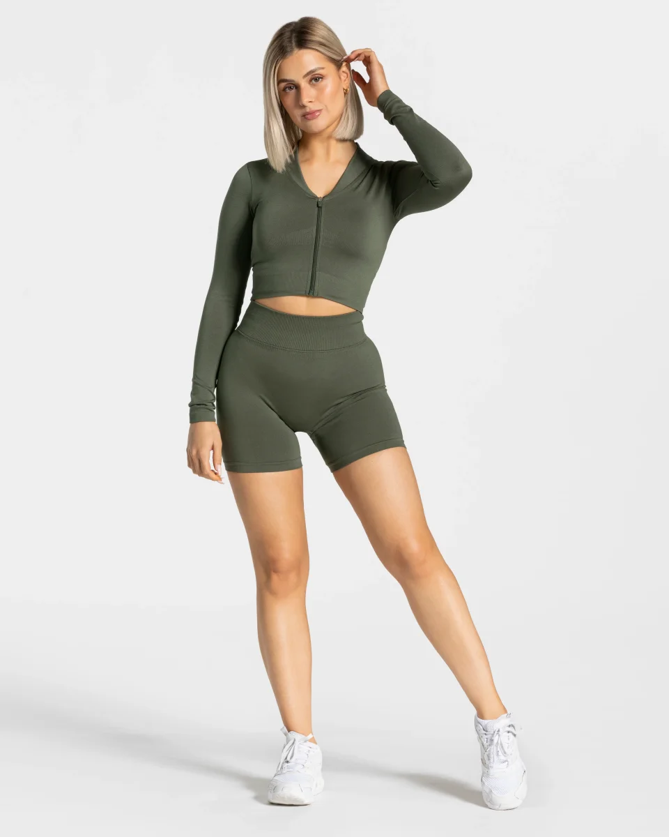 Unsere Statement Zip Jacke in Khaki lässt sich hervorragend mit der Statement Leggings und dem Statement Bh kombinieren. Gleichzeitig bist du so bestens für dein Training in den kälteren Jahreszeiten gewappnet.