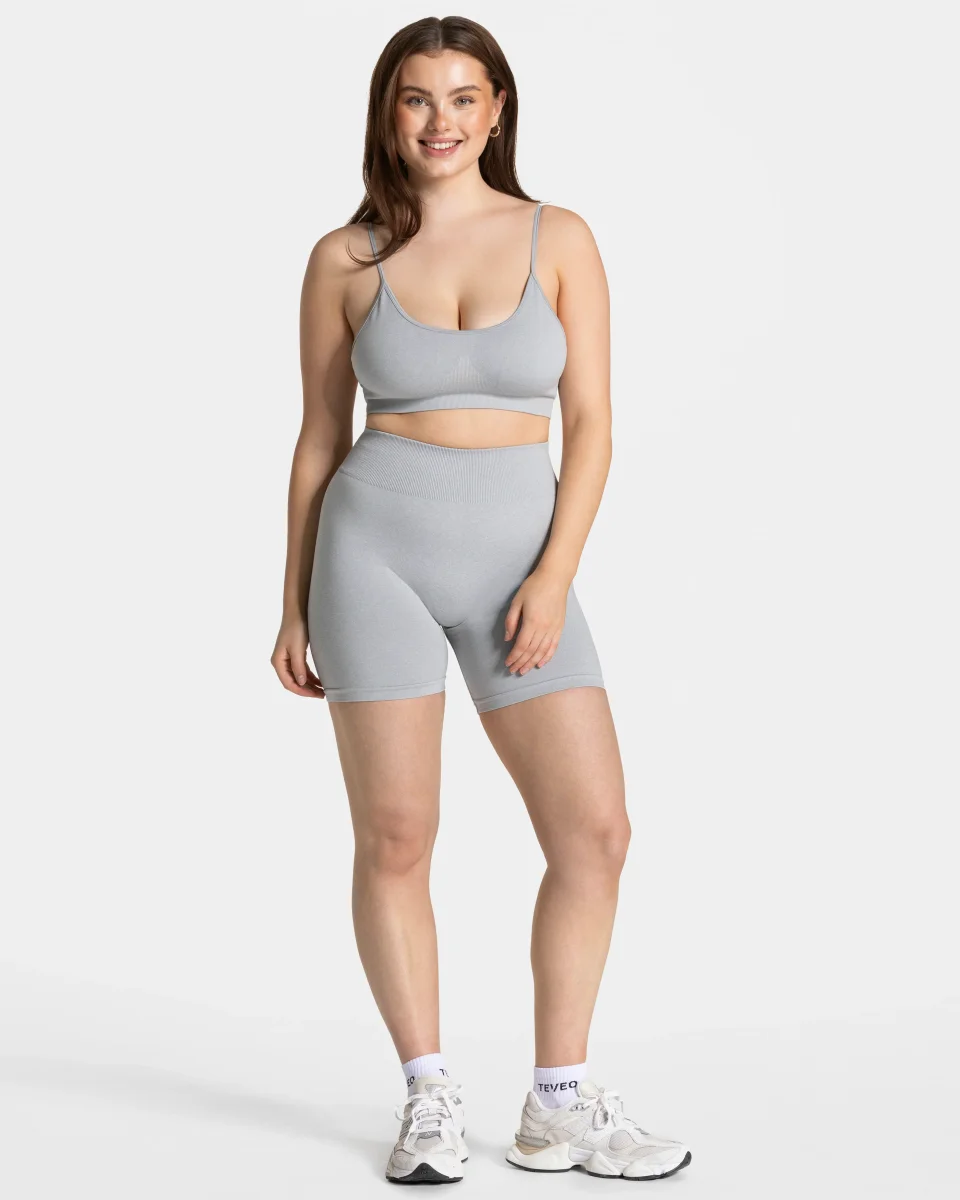 Die Timeless Pro Covert Scrunch Short in Hellgrau heben Shaping auf ein neues Level. Dank unserer weiterentwickelten Seamless-Technologie bietet die Short eine noch höhere Kompression. Ergänzend durch den beliebten Covert Scrunch sorgt die Leggings für den idealen TEVEO-Push. Das hochwertige weiße Logo setzt einen dezenten, aber stilvollen Akzent und rundet das Design perfekt ab.