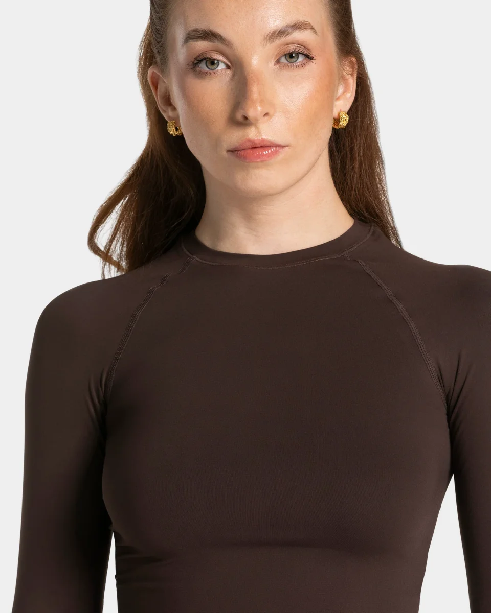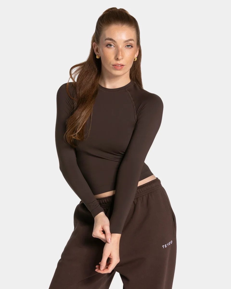 Das Timeless Pro Longsleeve in Espresso – second-skin feeling, but better. Ultraleicht, butterweich und nahtlos für ein unvergleichliches Tragegefühl. Das atmungsaktive Material schmiegt sich mühelos an deinen Körper, ohne einzuengen. Maximale Bewegungsfreiheit, pure Eleganz – ein Essential, das Maßstäbe setzt.