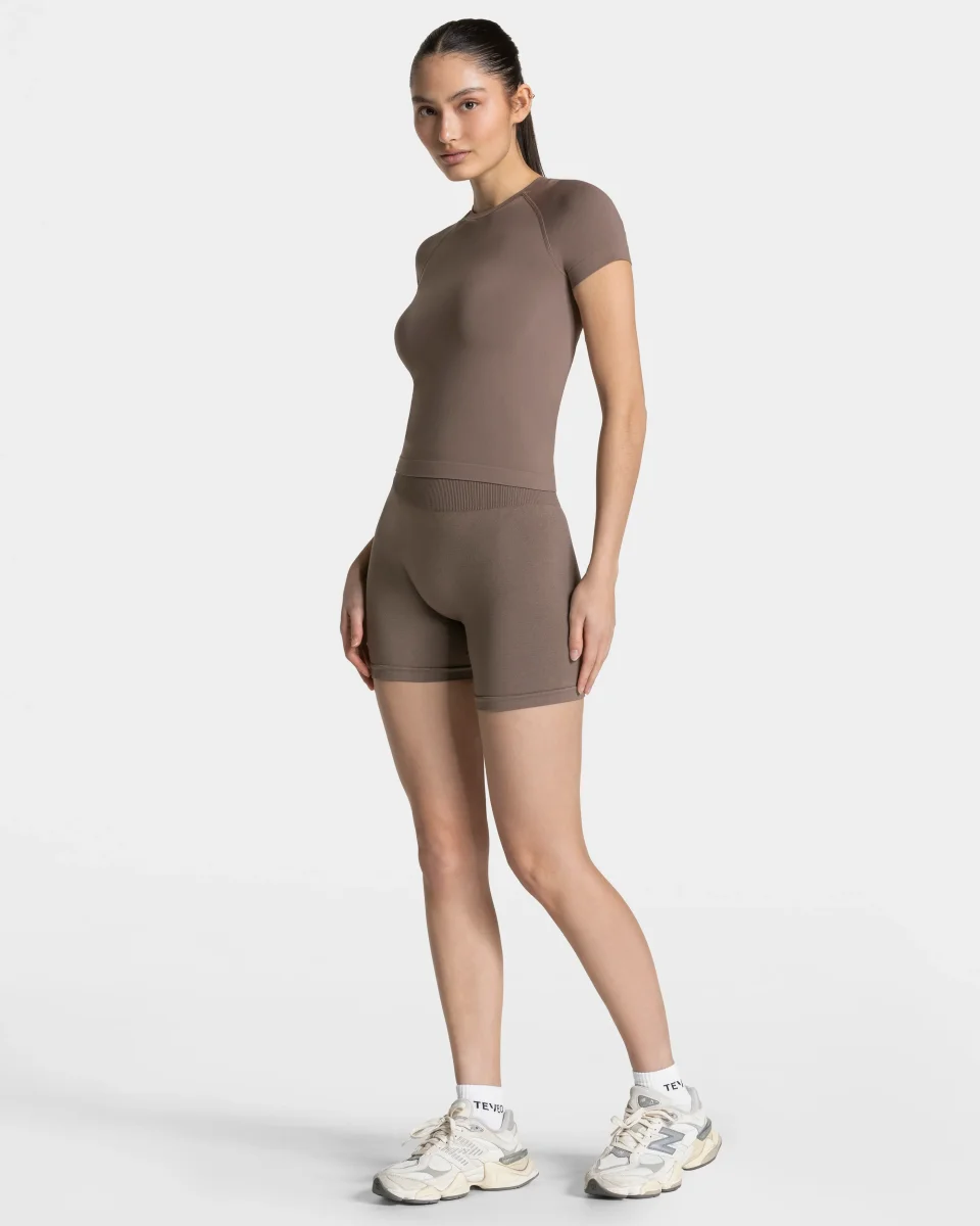 Das Timeless Pro T-Shirt in Mokka – second-skin feeling, but better. Ultraleicht, butterweich und nahtlos für ein unvergleichliches Tragegefühl. Das atmungsaktive Material schmiegt sich mühelos an deinen Körper, ohne einzuengen. Maximale Bewegungsfreiheit, pure Eleganz – ein Essential, das Maßstäbe setzt.