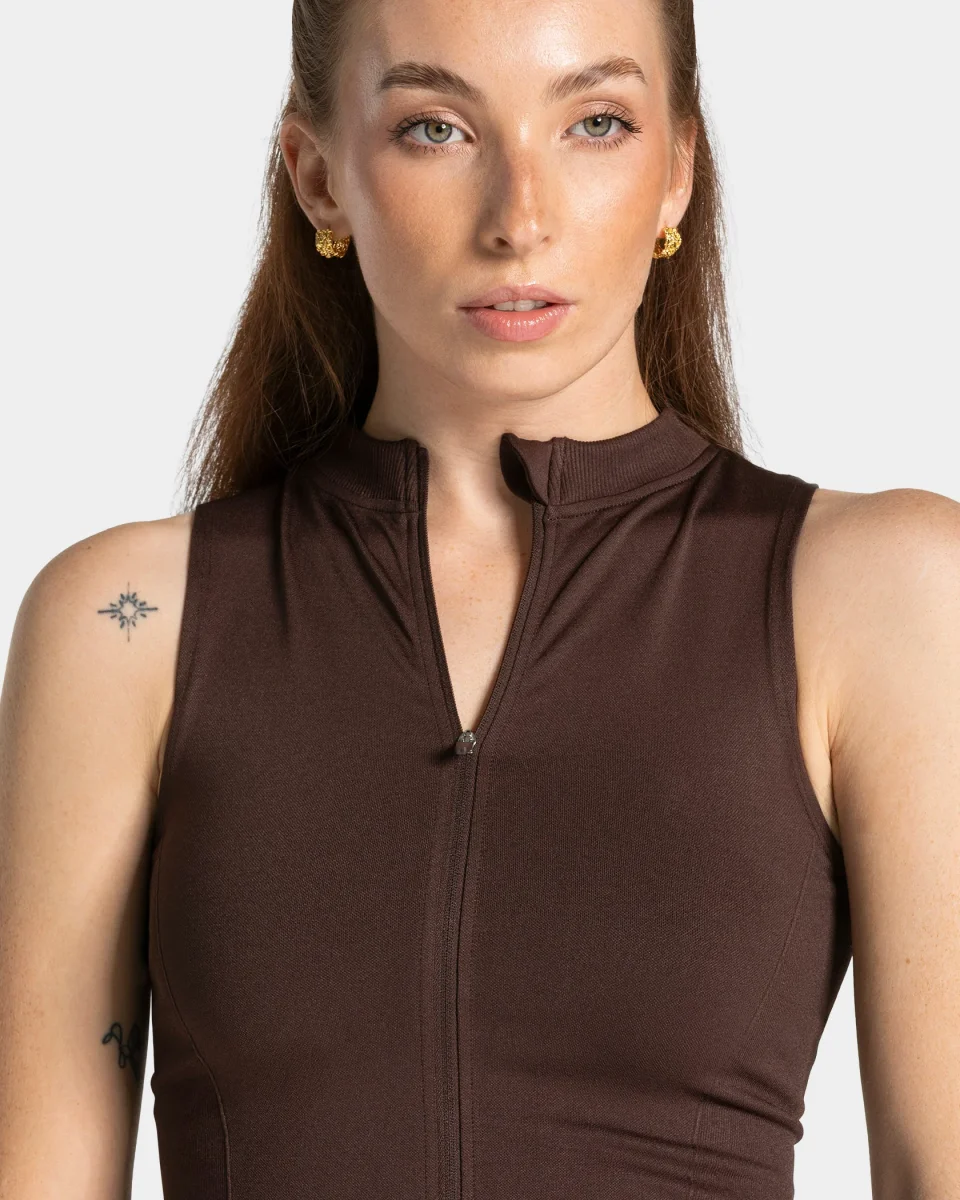 Inspiriert von der Femme Shaping Zip Jacke, kombiniert das Timeless Pro Zip Tank in Espresso den Look einer Shaping Zip Weste und figurbetonter Passform. Der Stehkragen sorgt für die Eleganz und die seitliche Rippstruktur für optimalen Shape und Halt. Der Zip Tank bietet dank des durchgehenden Zippers Flexibilität für eine sportliche, cleane Ästhetik oder einen entspannten Add On.